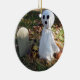 A photograph of a Graveyard, a Ghost, a Skull and a Pumpkin adorn this fun Halloween ornament!