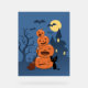 Un mignon chat noir et un balai de sorcière près d'une pile de citrouilles riants qui tombent. Un arbre mort, un manoir déplaisant, des chauves-souris et la lune sont vus sur l'arrière - plan.