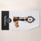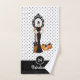 Designed by Farida Greenfield. A fashion illustration of a lady wearing gorgeous classic elegant long black dress holding a witch broom decorated with black ribbons with pumpkins on the foreground and black and white polka dots pattern on the background. It has customizable monogram initial and name on the lower side. Perfect design with Halloween theme.