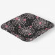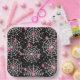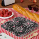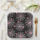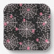 Paper plates with a cute seamless pattern with white cobwebs and pink spiders.