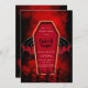 You will love these coffin with bat wings and spooky trees on a red and black smoky background. Matching invitations are available.