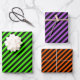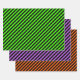 A set of striped wrapping paper in trick or treat Halloween colours; slime green,pumpkin orange,poison purple.