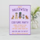 Illustration of three French Bulldog puppies of different colours in pumpkins dressed in Halloween attire.