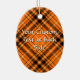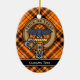 Halloween crest badge with flying bat surrounded by a strap and buckle over tartan background. Custom text on both sides.