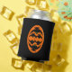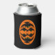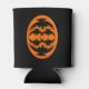 This awesome can cooler features an orange oval with six crows in it. Each crow has yellow eyes with black pupils and outstretched wings. The crows are flying towards each other forming an oval shape. The background is black.