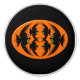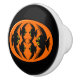 This awesome ceramic knob features an orange oval with six crows in it. Each crow has yellow eyes with black pupils and outstretched wings. The crows are flying towards each other forming an oval shape. The background is black.