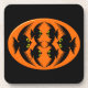 This awesome cork coaster features an orange oval with six crows in it. Each crow has yellow eyes with black pupils and outstretched wings. The crows are flying towards each other forming an oval shape. The background is black.