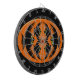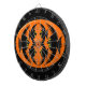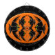 This awesome dart board design features an orange oval with six crows in it. Each crow has yellow eyes with black pupils and outstretched wings. The crows are flying towards each other forming an oval shape. The background is black.