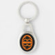 This awesome keychain features an orange oval with six crows in it. Each crow has yellow eyes with black pupils and outstretched wings. The crows are flying towards each other forming an oval shape. The background is black.