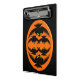 This awesome mini clipboard features an orange oval with six crows in it. Each crow has yellow eyes with black pupils and outstretched wings. The crows are flying towards each other forming an oval shape. The background is black.