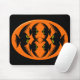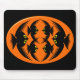 This spooky Halloween mousepad features an orange oval with six crows in it. Each crow has yellow eyes with black pupils and outstretched wings. The crows are flying towards each other forming an oval shape. The background is black.