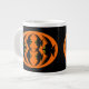 Cette énorme tasse présente un ovale orange avec six corbeaux. Chaque corbeau a des yeux jaunes avec des élèves noirs et des ailes étirées. Les corbeaux volent vers l'autre formant une forme ovale. L'arrière - plan est noir.