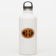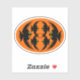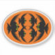 This awesome shaped sticker design features an orange oval with six crows in it. Each crow has yellow eyes with black pupils and outstretched wings. The crows are flying towards each other forming an oval shape. The background is black.