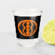 This awesome shot glass features an orange oval with six crows in it. Each crow has yellow eyes with black pupils and outstretched wings. The crows are flying towards each other forming an oval shape. The background is black.