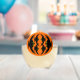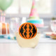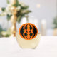 This awesome stemless wine glass features an orange oval with six crows in it. Each crow has yellow eyes with black pupils and outstretched wings. The crows are flying towards each other forming an oval shape.