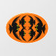 This awesome shaped window cling features an orange oval with six crows in it. Each crow has yellow eyes with black pupils and outstretched wings. The crows are flying towards each other forming an oval shape. The background is black.