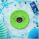 This cute little black spider sits on its web with a big smile on its face. Background is a green spotted pattern.