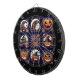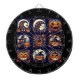 This vibrant and colourful illustration features a collection of Halloween-themed designs, centred around pumpkins. There are pumpkins with spooky faces, pumpkins with witches' hats, and pumpkins surrounded by bats and stars. Other elements include ghosts, skulls, and swirling patterns. The overall mood of the image is festive, spooky, and slightly eerie, perfect for Halloween celebrations.