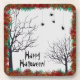 A colorful red, yellow and green fall foliage border with gnarly trees and hanging spiders grace the front of this fun "Happy Halloween!" themed beverage coaster!