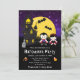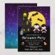 This fun and spooky Halloween invitation features cute vampires beside a crooked haunted house. In the background is a full moon with bats and a purple night sky with stars. The text combines decorative and serif fonts for a stylish and modern look. This is perfect for Halloween.