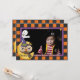 A festive, juvenile, photo invitation featuring an orange and black chequerboard frame, a friendly ghost, a dangling spider, an owl and half moon. Just add your favourite photo for a delightful Halloween invitation.