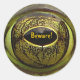 This scary Halloween sticker features a close up of a green frog's eye. Her iris is an incredible abstract pattern of gold and yellow. The pure black oval pupil in the centre reflects trees in the distance. The text reads: Beware! It can be customized or removed.