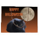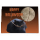 Black cats, full moons, and Halloween, oh my! This design features a black cat in front of a full moon with the expression "Happy Halloween" added.