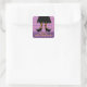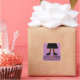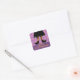 These fun Halloween stickers feature a witch's black dress with legs clad in orange and black striped stockings and her pointy black shoes with orange buckles. Background is a purple circles pattern. Text below reads "Happy Halloween!" Original art by Anne Coffey.