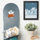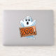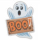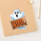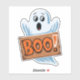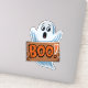 This Halloween design features a cartoon-style ghost with a surprise expression floating behind a wooden panel. The sign displays the word "BOO!" in red and shredded letters, evoking the classic fear associated with ghosts and Halloween surprises. The minimalist background highlights the ghost and the sign, creating a fun and festive design perfect for decorations, greeting cards or promotional material for Halloween events.