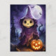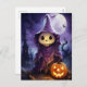 The image depicts a Halloween-themed scene featuring a spooky character. The character appears to be a ghost or a grim reaper-like figure with a jack-o'-lantern face. It is wearing a tattered, hooded cloak in shades of purple. The background shows a full moon, bats flying, and a haunted house with a dark, eerie atmosphere. There's also a carved pumpkin with a glowing face sitting in front of the character, adding to the Halloween vibe. The overall aesthetic is dark and whimsical, fitting the theme of Halloween and spooky settings.