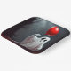 A ghostly figure holds a bright red balloon in a dark, eerie forest with twisted trees