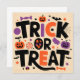 This Halloween design captures the festive and imaginative spirit of the season with a bright color palette and a fun theme. The words "TRICK OR TREAT" are displayed in the center, with bold black letters topped with orange keys, giving the impression of a dancing typography. Around the text, an eclectic collection of iconic Halloween icons, including smiling orange pumpkins with black cuts for the eyes and mouth, black bats with deployed wings, purple and orange candy in the shape of a candy or piece, a white spider web in the upper right corner with a small suspended spider, and several little floating purple ghosts. The setting evokes a joyful and childish atmosphere that is unique to the celebration of 31 October.