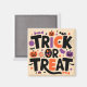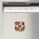 This Halloween design captures the festive and imaginative spirit of the season with a bright color palette and a fun theme. The words "TRICK OR TREAT" are displayed in the center, with bold black letters topped with orange keys, giving the impression of a dancing typography. Around the text, an eclectic collection of iconic Halloween icons, including smiling orange pumpkins with black cuts for the eyes and mouth, black bats with deployed wings, purple and orange candy in the shape of a candy or piece, a white spider web in the upper right corner with a small suspended spider, and several little floating purple ghosts. The setting evokes a joyful and childish atmosphere that is unique to the celebration of 31 October.