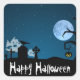 Happy Halloween night illustration featuring a spooky scene: ghosts at a cemetery, a crow on a gravestone and a pumpkin is hanging at a tree.