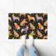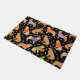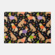Halloween Golden Retriever dogs with dark and light coats hold trick-or-treat pumpkins, wear witch hats and sweaters with scattered bats, paws and dog bones.