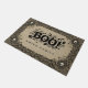Welcome guests in spooky style with this gothic Halloween welcome mat with bold “BOO!” lettering surrounded by skulls, bats, pumpkins, ghosts, and vintage patterns. This design can be personalized with your family name for a unique Halloween decoration.