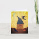 Fanciful Halloween greeting card with tiny house, flying witch, crow, crescent moon, and pumpkins. Blank on inside.