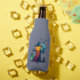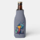 Bottle cooler with a cool halloween illustration. Set on a grey purple background. A large haunted scarecrow, looking evil with a jack-o-lantern pumpkin head, wearing a witches hat. He has a menacing grin wearing tattered robes and is standing in a graveyard with a crow screeching on his arm. Bats flying off in the distance, a full moon in the background and a lone owl with glowing eyes sits on a tombstone. The back text says spooky juice, and can be customized to say what you like.