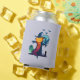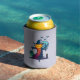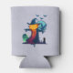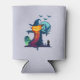Can cooler with a cool halloween illustration. Set on a grey lavender grunge background. A large haunted scarecrow, looking evil with a jack-o-lantern pumpkin head, wearing a witches hat. He has a menacing grin wearing tattered robes and is standing in a graveyard with a crow screeching on his arm. Bats flying off in the distance, a full moon in the background and a lone owl with glowing eyes sits on a tombstone.