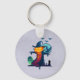 A keychain with a cool halloween illustration. Set on a grey lavender grunge background. A large haunted scarecrow, looking evil with a jack-o-lantern pumpkin head, wearing a witches hat. He has a menacing grin wearing tattered robes and is standing in a graveyard with a crow screeching on his arm. Bats flying off in the distance, a full moon in the background and a lone owl with glowing eyes sits on a tombstone.
