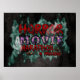 Halloween horror movie watching in progress in dripping blood red with purple marquee letter lights, ghosts and green fog on grunge black background
