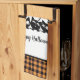 Kitchen towel is shown in a festive Halloween cats print with a plaid border trim.