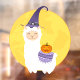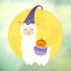 Cute white llama in a purple witch's hat carrying a jack o'lantern. Full yellow moon in the background and a dusty purple-blue background.