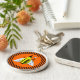 The background is a pattern of orange and black stripes.