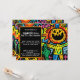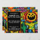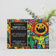 This invitation is like a haunted carnival designed by a hyperactive artist with a love for neon. Every inch is packed with wild, hand-drawn doodles—grinning pumpkins, mischievous ghosts, bats that look like they just heard a terrible joke, and a skeleton who’s clearly the life of the party. The colours? Oh, they’re fantastically loud—think electric oranges, radioactive greens, and purples so deep they might just summon a vampire.