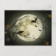 A crow perched on a tree branch and bats flying through the night air with a full moon and stars in the background.