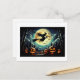 A witch on a broomstick flies across a full moon in a dark, eerie forest. Jack-o'-lanterns with sinister grins illuminate the ground below, enhancing the spooky atmosphere.