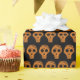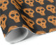 Orange and black skull pattern on Halloween gift wrap.