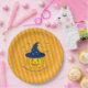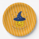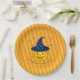 Halloween paper plates features orange sparkly stripes, kid-friendly pumpkin wearing a blue witch hat filled with sparkly white stars and blue bats flying.