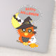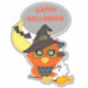 Here is a cute way to wish everyone a "Happy Halloween". A little orange owl wears a black witch hat and rides his broom. A little black spider dangles from the hat brim, and a small white ghost dances beside him. Behind him is a bat flying in front of a yellow crescent moon, and a grey banner that says "Happy Halloween". *Design credit to Digital Scrap Images.